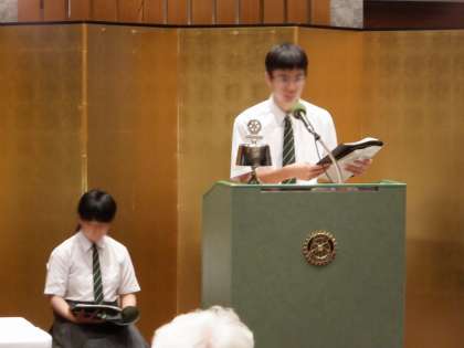 昨年度に引き続き、京都南ロータリークラブ様の例会にご招待いただきました。「本校の学びの特徴と職場体験実習の関わりについて」と、京都南ロータリークラブ会員様の会社で職場体験実習をさせていただいた生徒が、昨年度の実習の様子を発表しました。210名の方々の前での発表でしたが、落ち着いて自分の実習の様子を伝えることができました。発表後は、職場体験実習実施について、いくつかのご質問をいただき、互いに意見を交わし合う貴重な機会となりました。京都南ロータリークラブ様とのご縁を大切にして、今後も、ご協力をいただきながら、生徒たちの成長に繋がる取組を行っていきたいと思います。