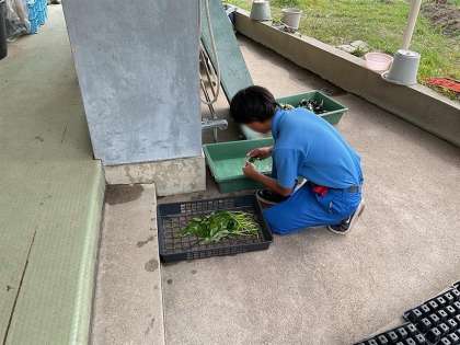 空心菜の販売準備では、まず、食べれる場所と廃棄する場所を選別し、一つ一つ水洗いをして、袋に入れていました。「大変ですね。」と言葉をかけると、「砂などが入らないように、一つ一つ洗っています。」と、大切な作業なので丁寧に行っていることを教えてくれました。