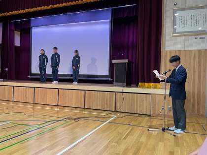 後期始業式のあと、全校集会を行いました。まずは、生徒会から生徒会選挙についての話がありました。そのあと、壮行会を行いました。10月25日〜27日に滋賀県で行われる『全国障害者スポーツ大会 わたSHIGA輝く障スポ2025』に本校より2名の生徒が出場します。壮行会では、出場する競技の紹介や意気込みの発表があり、校長先生からは応援メッセージが送られました。会場の生徒・教職員全員からは、2人を応援する大きな拍手が送られました。今まで練習してきた成果が存分に発揮でき、それぞれがやり切ったと思える大会になるよう、学校全体で応援したいと思います。