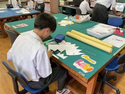 情報印刷室を覗くと、児童館との協働活動の準備を進めていました。運動会のメダルを作成したり、ワークショップで企画中の写真ブースで使う小道具を作ったりしていました。また、社内報に使うイラストのデザインの発注を受けている会社の担当者の方と、リモートで打ち合わせをしている生徒もいました。様々な仕事を役割分担し、責任をもって進める姿がありました。