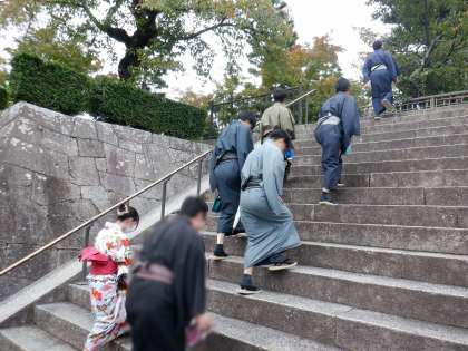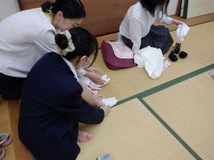 10月20日(月)5・6時間目に、3年生がきもの着付け体験を行いました。一人ひとりに用意された足袋を履き、着付けをしていただきました。普段、袖を通す機会の少ない着物を羽織ると背筋が伸びる感じがしました。また、着物の綺麗な模様を見て、自然と笑顔が溢れました。せっかくの機会ですので、着物で金戒光明寺や真如堂へ出かけました。