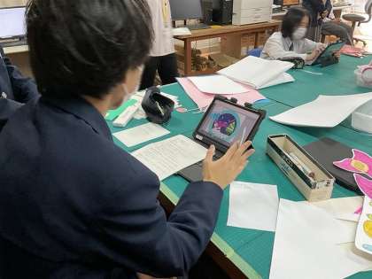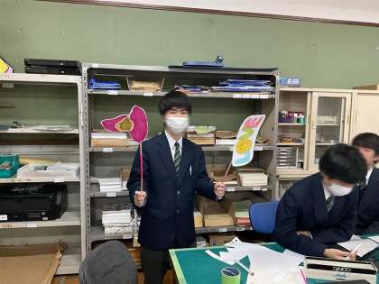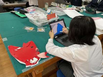 情報印刷室を覗くと、今日も様々な作業に取り組んでいました。11月に予定されている錦林児童館でのワークショップに向けて、頭につけるヘッドピースのデザインを考えたり、フォトブース体験のグッズを作ったりしていました。また、社内報に載せるイラストのデザインの依頼も受けていて、12月号のデザインを考えていました。