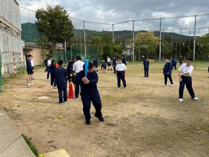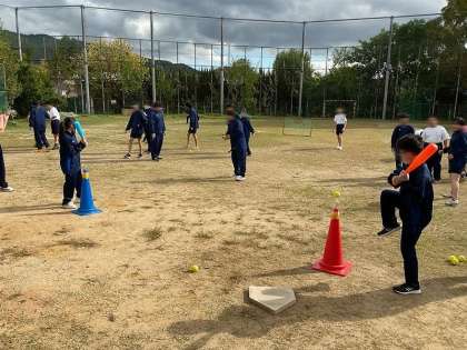 スポーツの秋。今日は少し肌寒かったですが、太陽の光が当たると温かく、身体を動かすにはとてもいい季節です。グラウンドを覗くと、1年生がTボールに取り組んでいました。日本シリーズやワールドシリーズが開催されていて、連日、ニュースを賑わしているので、生徒たちもバットを握る手に力が入っていました。試合前には、しっかりとお互いにあいさつをして、試合開始です。