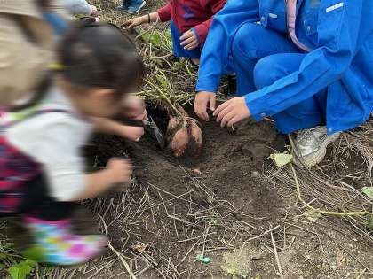 畑に移動し、芋ほりをしました。土を掘ると、とっても大きなサツマイモの姿が現れました。大きくて掘りほこすのに苦労しながらも、一生懸命スコップを動かす姿が印象的でした。