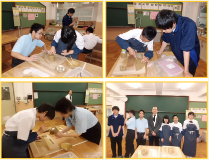 メインは、陶芸体験でのカップ作りと、三十三間堂の観光。本年度初の修学旅行生受け入れということで、経験豊富な3年生4人が担当させていただきました。挨拶・自己紹介ののち、早速カップ作り開始です。教えて下さるのは、いつもお世話になっている清水焼作家の森里龍生先生。本校生は中学生のカップ作りをお手伝いしつつ、森里先生のお話に驚いたり感心したり、忙しくも楽しい時間を過ごしました。