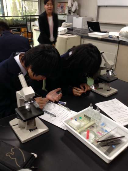 クラス毎に分かれ、「水」「音」「砂」「シロアリ」について授業を受けました。顕微鏡を覗いたり解剖をしたり真剣に取り組んでいました。