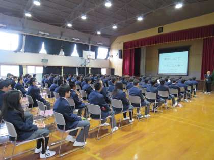 本日,1時間目に憲法月間の取り組みをしました。全校生徒が体育館に集まり,校長先生から憲法の話を聞きました。日本国憲法の3原則については校長先生からの問いかけに対して生徒の方から国民主権・平和主義・基本的人権の尊重という答えが返っていました。