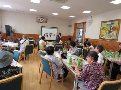 本日,岡崎学区社会福祉協議会が主催されている「岡崎いどばたサロンが」が開催されました。今年度最初のいどばたサロンには,地域の方が30名ほど集まられて警察の方から特殊詐欺の話を聞かれたり,談笑されたりの時間を過ごされました。