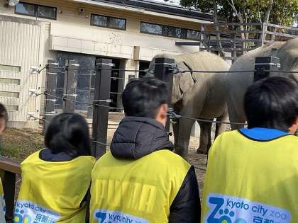 後半は、実際に動物が自分たちが寄付した野菜を食べている様子を見学させていただきました。飼育員の方が野菜が入った袋を持ってくると、たくさんのゾウが近寄ってきました。