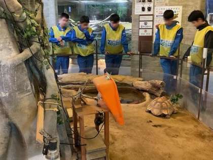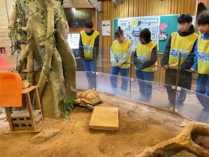 ケヅメリクガメが大根葉を食べている様子を見学させていただきました。大根葉が置かれると、大根葉を目掛けてゆっくりゆっくり動いていました。モグモグと大根葉を食べる姿は、とてもかわいかったです。