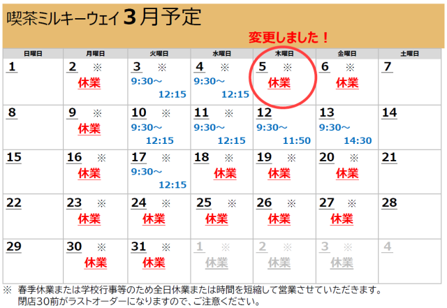 いつも喫茶ミルキーウェイ営業をご利用いただき、ありがとうございます。先日掲載しました『[3月]喫茶ミルキーウェイ営業カレンダー』の訂正がございますので、お知らせいたします。