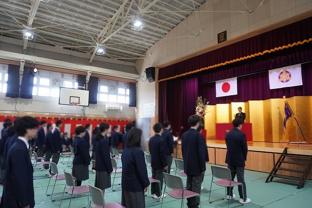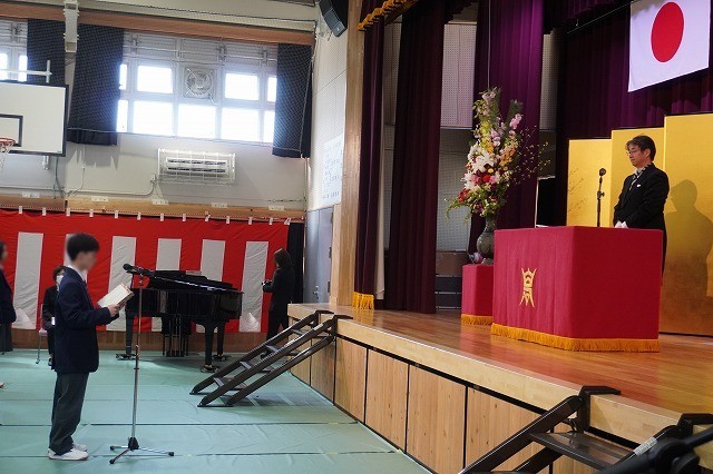4月9日(木)に令和8年度入学式を行いました。今年度も35名の新入生を迎えることができました。新しい制服に身を包み、初めての登校となった新入生たち。緊張した様子も見られましたが、新しい学校生活の始まりに、期待に満ちた表情が印象的でした。新入生代表のことばでは、「私には大切にしている言葉があります。『諦めるのは簡単です。それは自分には似合わない。』という言葉です。学校生活では、つらいことや大変なこともある思います。それでも、簡単にあきらめず、いろいろなことに挑戦していきたいです。」と、力強い決意が述べられました。35名の仲間とともに、入学した今日の気持ち、夢や希望を大切にしながら、充実した3年間の学校生活を送ってほしいと願っています。