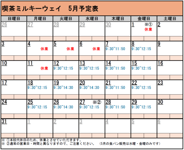 5月・6月の喫茶ミルキーウェイ営業カレンダーを掲載しました。皆さまのご来店お待ちしております。