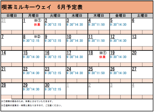 [5月・6月]喫茶ミルキーウェイ営業カレンダー