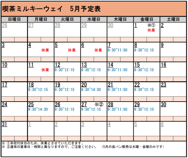 【訂正版】[5月]喫茶ミルキーウェイ営業カレンダー
