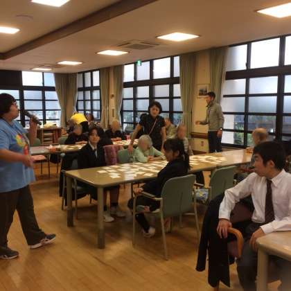 2年生の流通・サービスの授業で高野デイサービスセンターに伺い、利用者さんのレクリエーションに参加させていただきました。この日は、ひらがなのカードを組み合わせて、時間内にできるだけたくさんの言葉を作るゲームでした。『体のパーツ』『色の名前』など、さまざまなお題に応じて、利用者さんと生徒たちでワイワイとカードを並べて相談しながら楽しみました。デイサービスからの帰り道には、それぞれの交流の様子を生徒同士が振り返りながら嬉しそうに歩く姿がありました。次回の訪問も楽しみです!