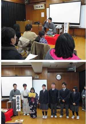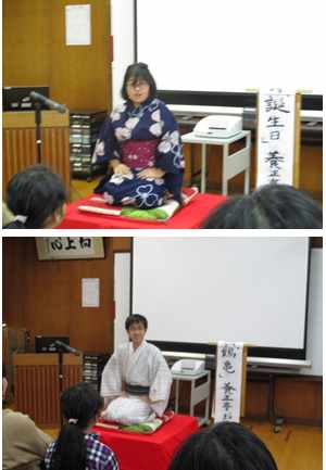 最初に保育園での「読聞かせ」について、『あんぱん食パン』の手遊び歌を実演しながら説明しました。次に介護予防のための高齢者健康体操教室について、実際にやっている「脳トレ」を2つ、会場の皆さんと一緒にやりました。最後に、今年度から取り組んでいる「小咄」を3名の噺家(生徒)が披露し、会場を爆笑の渦に巻き込んでいました。