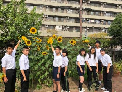 コミュニティサービスから譲り受けて種を植えた「はるちゃんのひまわり」が満開になりました。