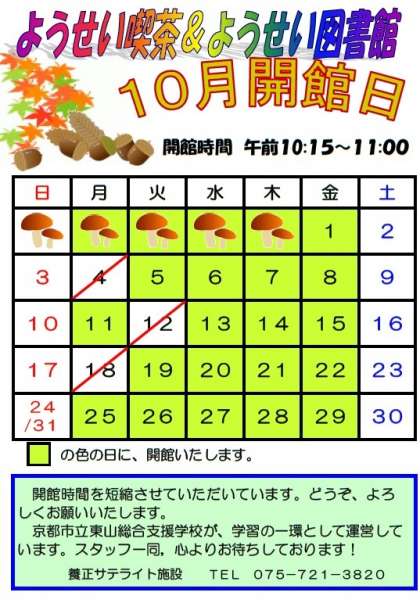 養正サテライト施設の,喫茶と図書館の10月の開館日です。