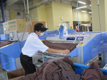 山積みのタオルを全員で畳んだり,機械にタオルを流す作業をしたりしました