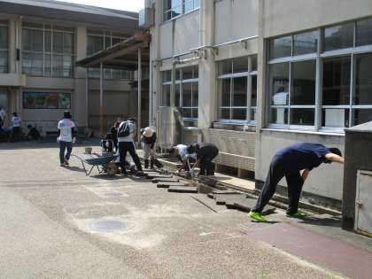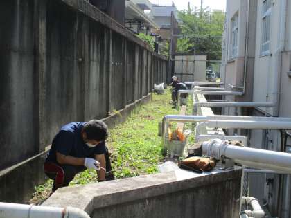 教職員で清掃箇所を分担して、雑草の除去作業や倉庫の物品整理、排水溝の清掃などを行いました