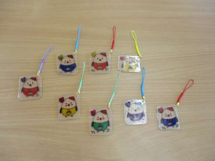 プラ板に食品サービスの生徒達がデザインしたキャラクターを描き、色付けをしています