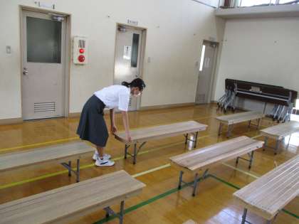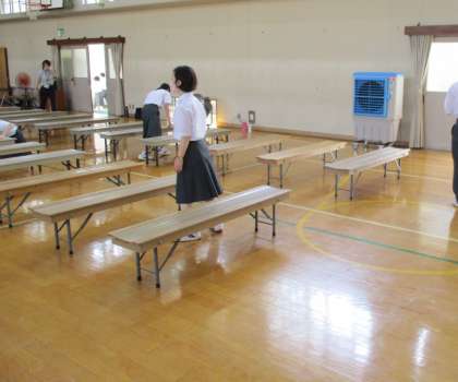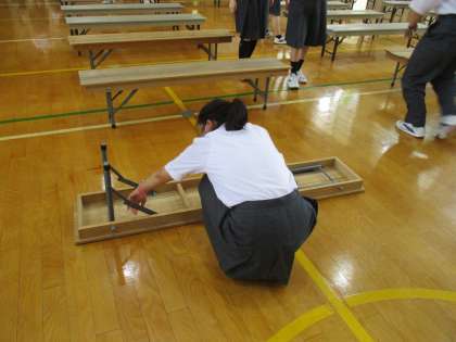 体育館準備、みんなで力を合わして椅子並びをしています