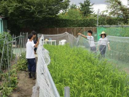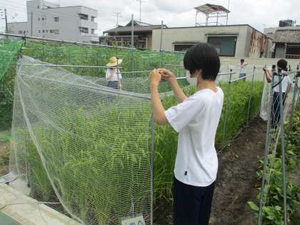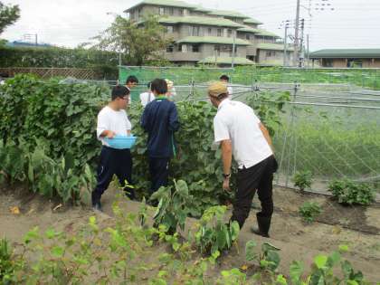 生徒たちが大きくなった夏野菜を収穫しています