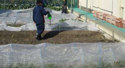 小春日和の中、コミュニティサービスの生徒たちはぽかぽかファームの野菜の栽培に取り組んでいます
