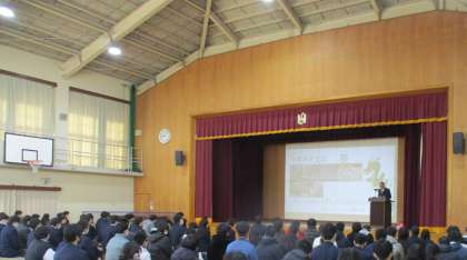 1限目に、生徒会の生徒たちが司会進行を務め、全校集会が行われました