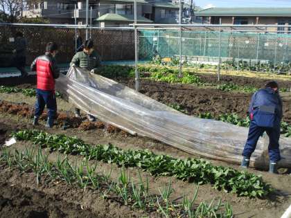 仲間と相談をしながらビニールハウスを立てています