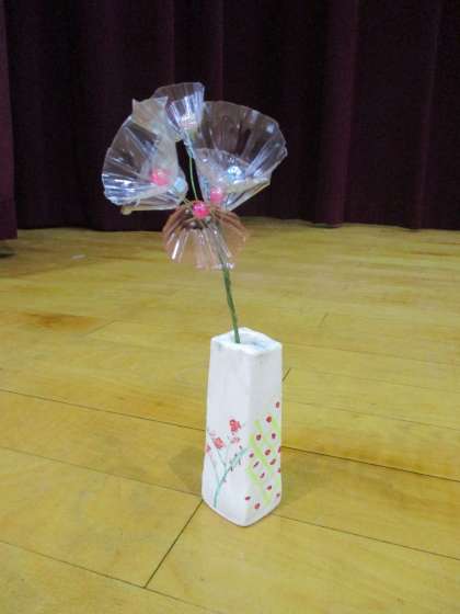 今回のすこやかサロンは、卵の透明ケースとビーズ、針金を使って模擬花を作りました