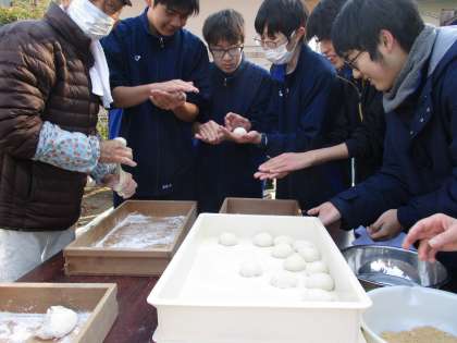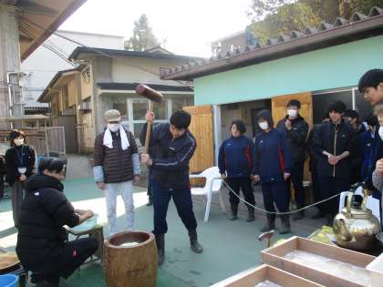 ぽかぽかファームで育て、昨年秋に収穫したもち米を使用し、餅つき大会をおこないました。地域の方も多く来ていただいてご協力いただきました。杵でもちをつくときは、周りの生徒からも「よいしょ—」と大きな声が聞こえました。きなこ、しょうゆ、大根おろし、おしるこの4種類の味でおいしくいただきました。