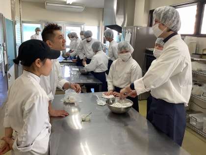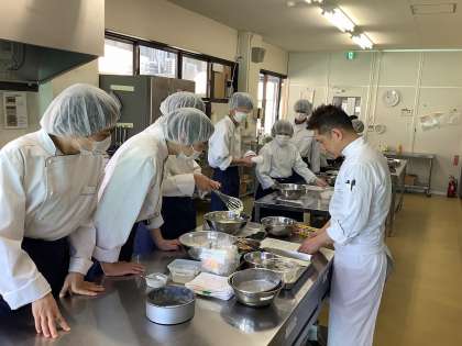 開校当時からお世話になっている方と卒業生の2名のパティシエさんをお迎えして、「レモンのパウンドケーキ」と「メレンゲ」を教えて頂きました。養正サービスから納品して頂いたレモンを使って、3年生がレシピを考え試作を繰り返していましたが、バターと卵が分離してしまい中々成功することができませんでした。 今回パティシエさんから分離しないような奥の手を数々教えてもらい、ふわっとしたケーキを焼き上げることができました。製菓の知識だけでなく、「心を込めて作ると美味しいケーキができてお客様に喜んでもらえるので楽しんで作りましょう」という心構えや、もうすぐ社会に出る3年生に、働くことの意義や職場の人との関わり方などもアドバイスを頂きました。4月からの新しい職場に期待や不安を抱えている3年生にとって、背中を優しく押してもらえる機会となりました。