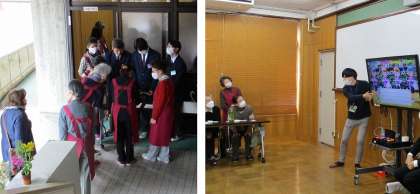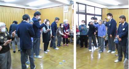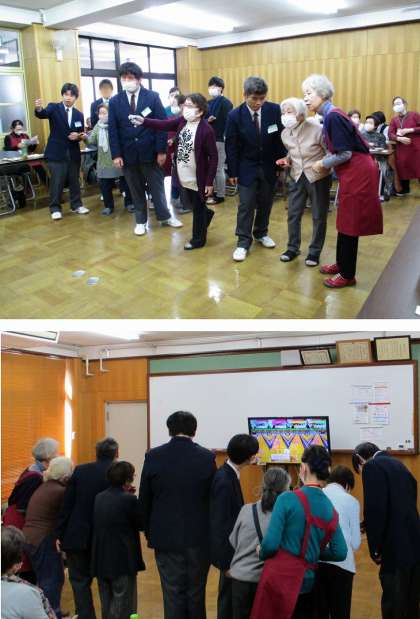 今年度最後のすこやかサロンは、東山区社会福祉協議会の方に市販のゲーム機を使用したボウリングゲームを用意していただき、説明を受けた後ゲームをおこないました。4チームに分かれ、一人1フレームずつ投げ、合計点数を競いました。生徒が参加されている方に持ち方や投げ方を丁寧にアドバイスする姿が見られました。ストライクやスペアが出ると、同じチームのメンバーから拍手や歓声があがっていました。