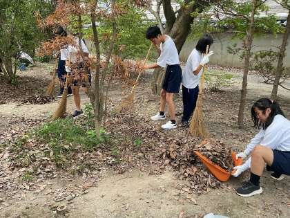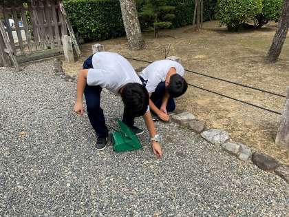 三十三間堂では、庭の落ち葉を竹ほうきや熊手を使い集め、手箕(てみ)で収集し、ごみ袋に入れていきました。生徒同士で声を掛け合ったり、ごみ袋に入れる際に集めた落ち葉がこぼれないように、サッと動いてごみ袋の口を広げ助ける行動も見られました。