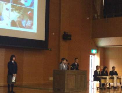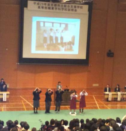 職業学科の概要を説明した後,学校生活について各校の生徒が発表しました。東山では,普段の学習の様子の一部として,手遊び歌や東山界隈の観光案内をしました。会場の中学生や保護者の方も一緒に手遊び歌を歌い,参加してくださいました。