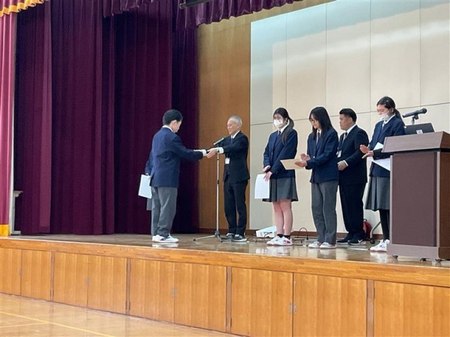 その後、生徒会の司会進行により、表彰式が行われました。学習の成果を評価していただき、とてもうれしそうな表情で賞状を受け取っていました。
