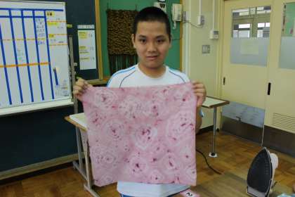 出来上がった藍染絞りの布にアイロンをかけていきます。絞り染めをしたときに布が少しいびつな形になっているものを,端っこまで丁寧にアイロンがけをしていきます。根気のいる作業ですが,最後まで丁寧に取り組めました。