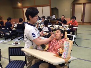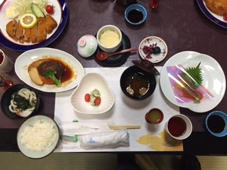 夕食は宿舎自慢の献立です。今日1日活動してみんな腹ペコです。おいしい夕食をとり,お腹一杯になりました。