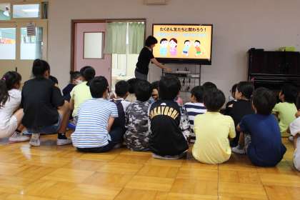 授業を始める前にお互いのことを紹介し合ってから一緒に活動しました。子どもたちは言葉かけ,ハイタッチ,指さし、サインなどいろいろな方法でコミュニケーションを取り合っていました。
