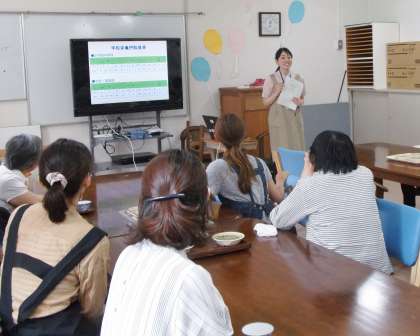 給食試食会の始めに,本校栄養教諭から総合支援学校の給食について,特別食・アレルギー食・カロリー調整食など,献立の工夫について説明しました。特別食の説明では,実際に試食していただくことでより分かりやすく伝えることができました。