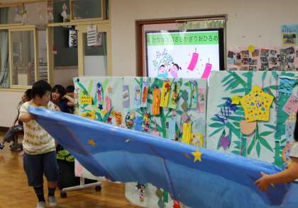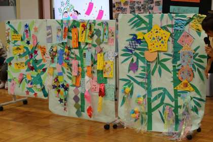 児童会代表のあいさつのあと『手と手と手と』を振りを付けて歌いました。次に,おんがくクラブの発表があり7月にちなんだ『海』の歌を楽しみました。歌が終わったあと,『七夕のささかざり』のおひろめがありました。みんなの願いが込められた素晴らしいささかざりが紹介されました。