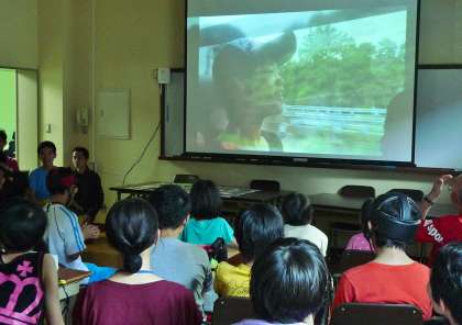 まず、1日目の活動です。大きなプロジェクター画面に先輩が映ると、1年生、2年生から歓声があがっていました。