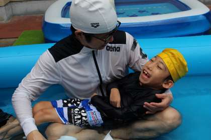 中庭でもビニールプールに入ったり,足を水に浸したりと水に親しむ学習ができました。