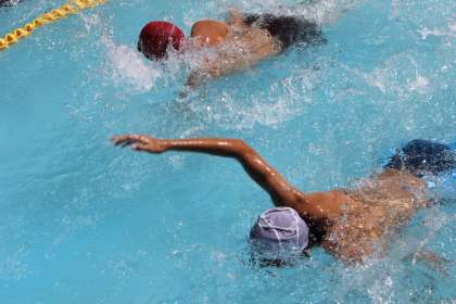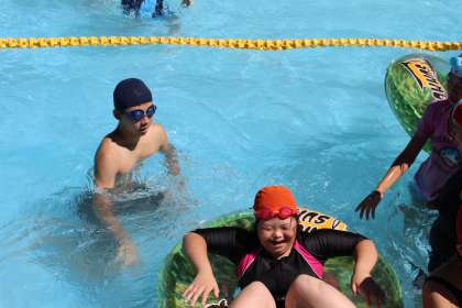 プールサイドにも水しぶきが上がり,歓声が響いていました。