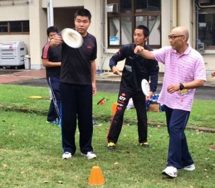 生徒の練習の様子を見ながら,フォーム,ディスクの握り方,投げるときの手の動かし方など,手本を示しながらていねいに教えていただきました。