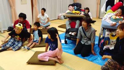 昨夜はみんな夕食をしっかり食べ,お風呂の前に大広間に集まってお楽しみ会をしました。