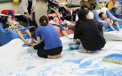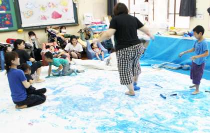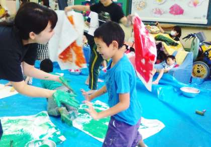 小学部1・2年生は『ぞうけいあそび』をしました。教室いっぱいに模造紙を広げ,好きな色の絵の具を選び,ダイナミックに体を動かしながら手や足で模造紙に色をつけました。みんな大喜びで活動しました。