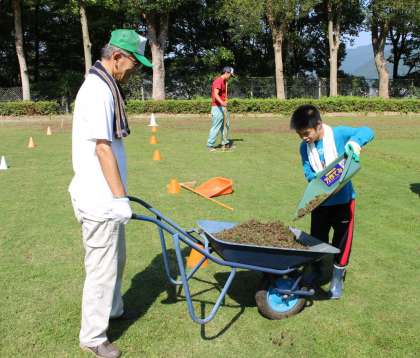 作業は,最初にコアリング(穴あけ)を行いました。これは,芝生の下の土に穴をあけて土を抜いてやり,水や肥料や空気が土の中に入りやすくするためと,穴をあけた時に芝生の根を切り,そこから新しい根を出させることで芝生を若返らせて元気にするために行うそうです。生徒たちは業者の方が機械を使って穴をあけた時に出る土を集めて,土の少ない所に運んだりしました。